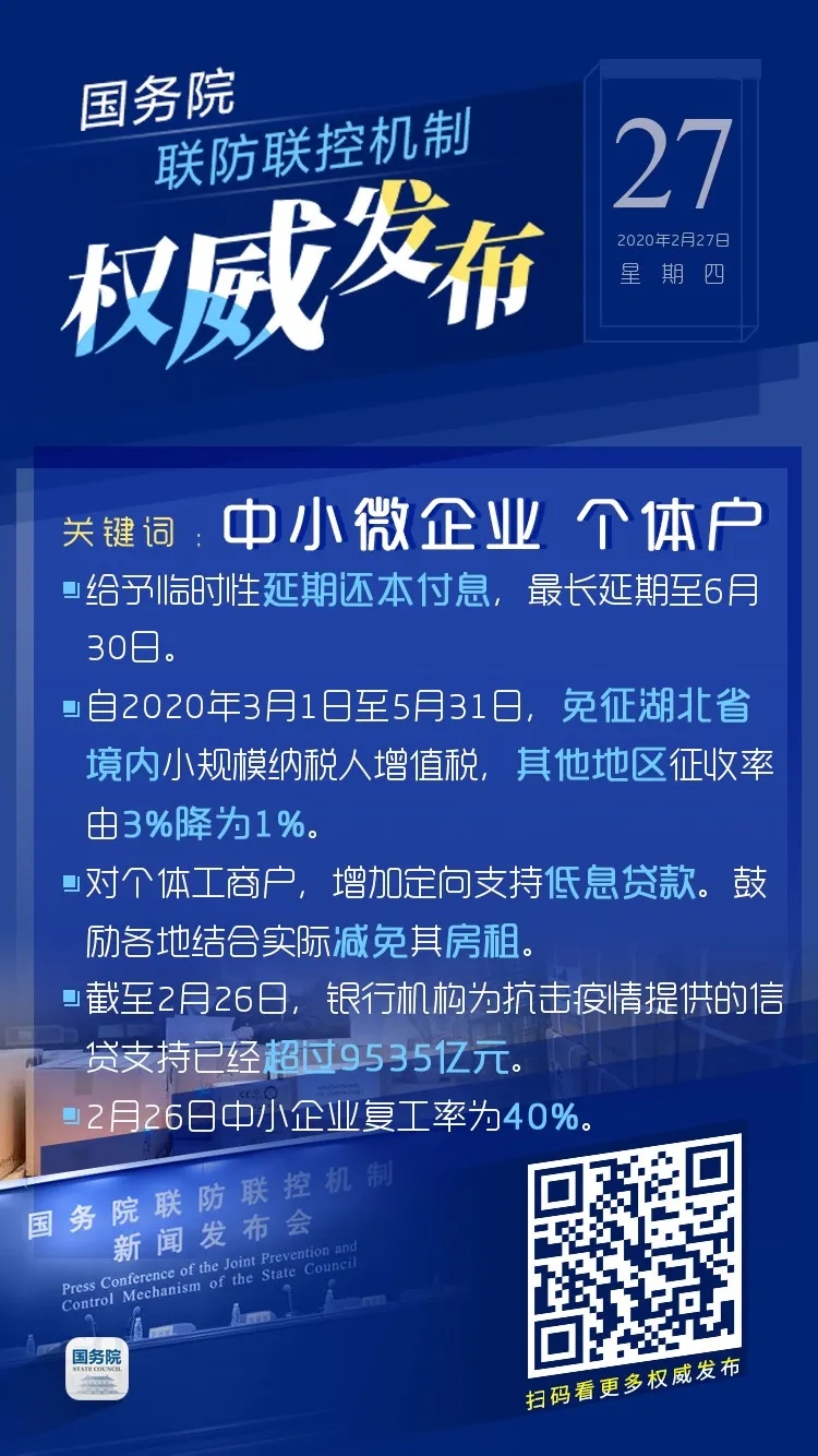 2月26日,应急管理部制定出台统筹推进企业安全防范和复工复产八项措施,具体措施为:一是到期证件自动顺延。二是行政审批网上办理。三是简化复工复产程序。四是主动为企业减负。实行安全检查上下级备案、结果互认,避免重复检查。五是推行安全生产承诺制。六是开展专家安全指导定制服务。七是加强线上安全教育培训。八是落实安责险惠企措施。会同财政、银保监机构为已投保和续保企业延长保险期限、缓交保费,减免新投保企业保费,将保险公司安全预防费用优先用于参保企业疫情防控工作。