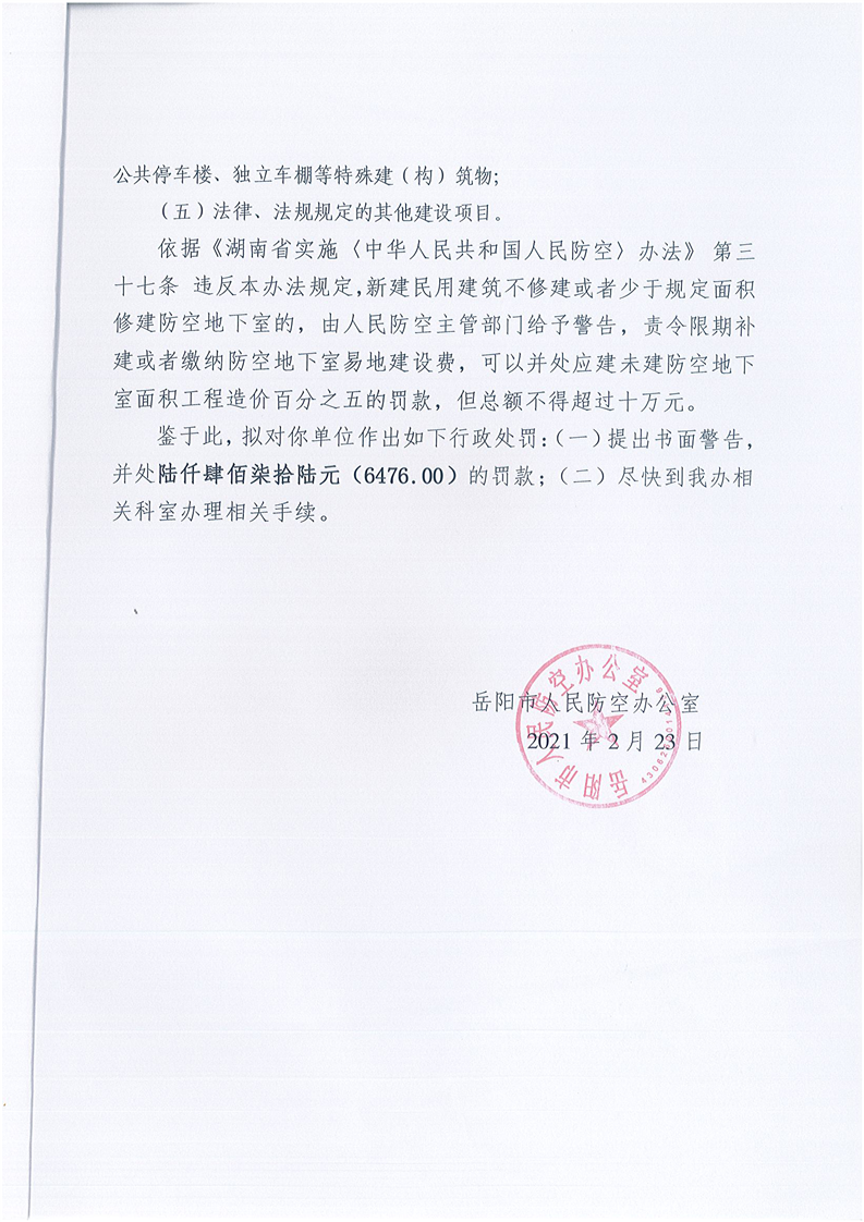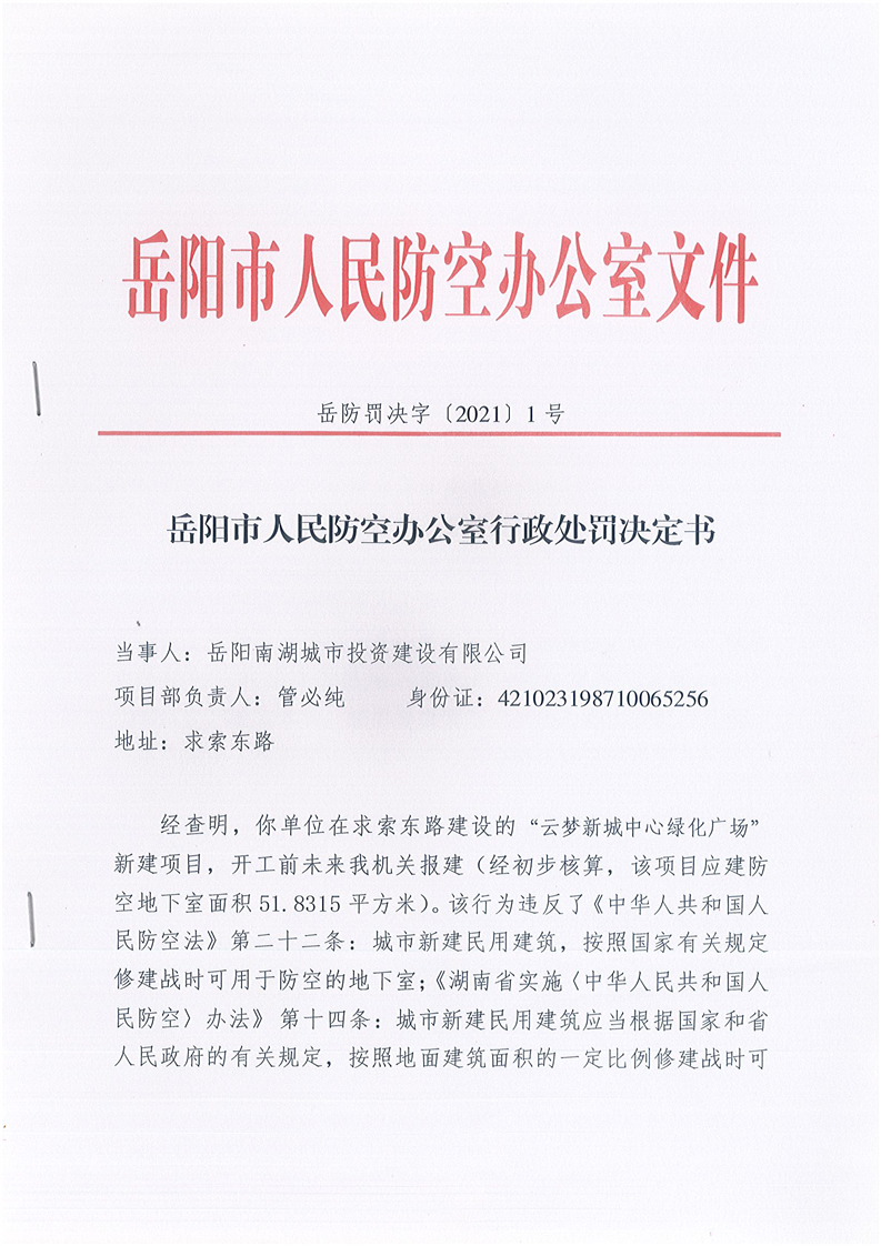 岳阳市人民防空办公室行政处罚决定书(云梦新城中心绿化广场)