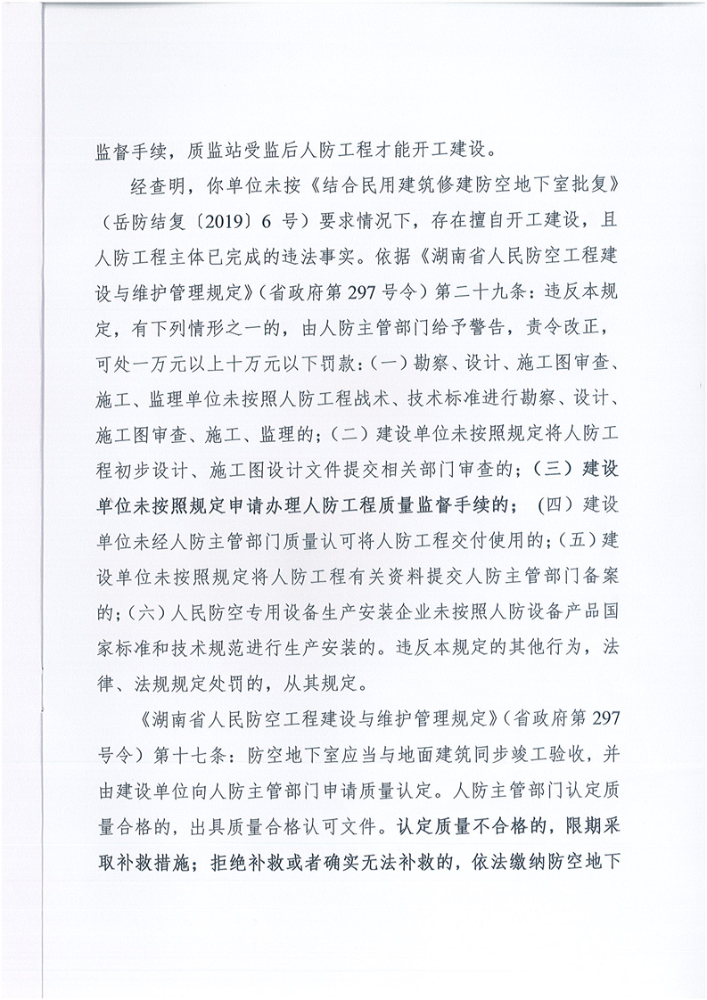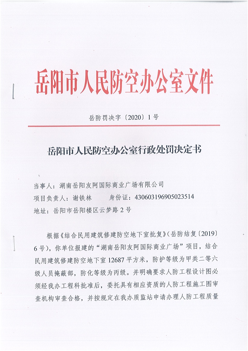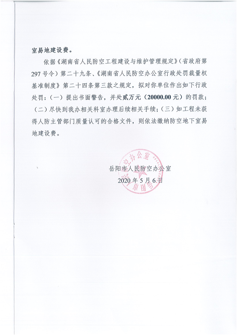 岳阳市人民防空办公室行政处罚决定书1