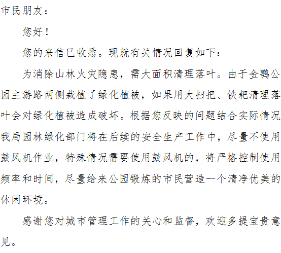 金鹗山公园用于清理树叶的汽油吹风机,对于去公园里锻炼身体的人们是一种不良刺激,因为这是噪音和汽油燃烧后气味的双重污染。为了让市民有一个清静优美的休闲锻炼环境,建议尽快取消这种清扫方式!