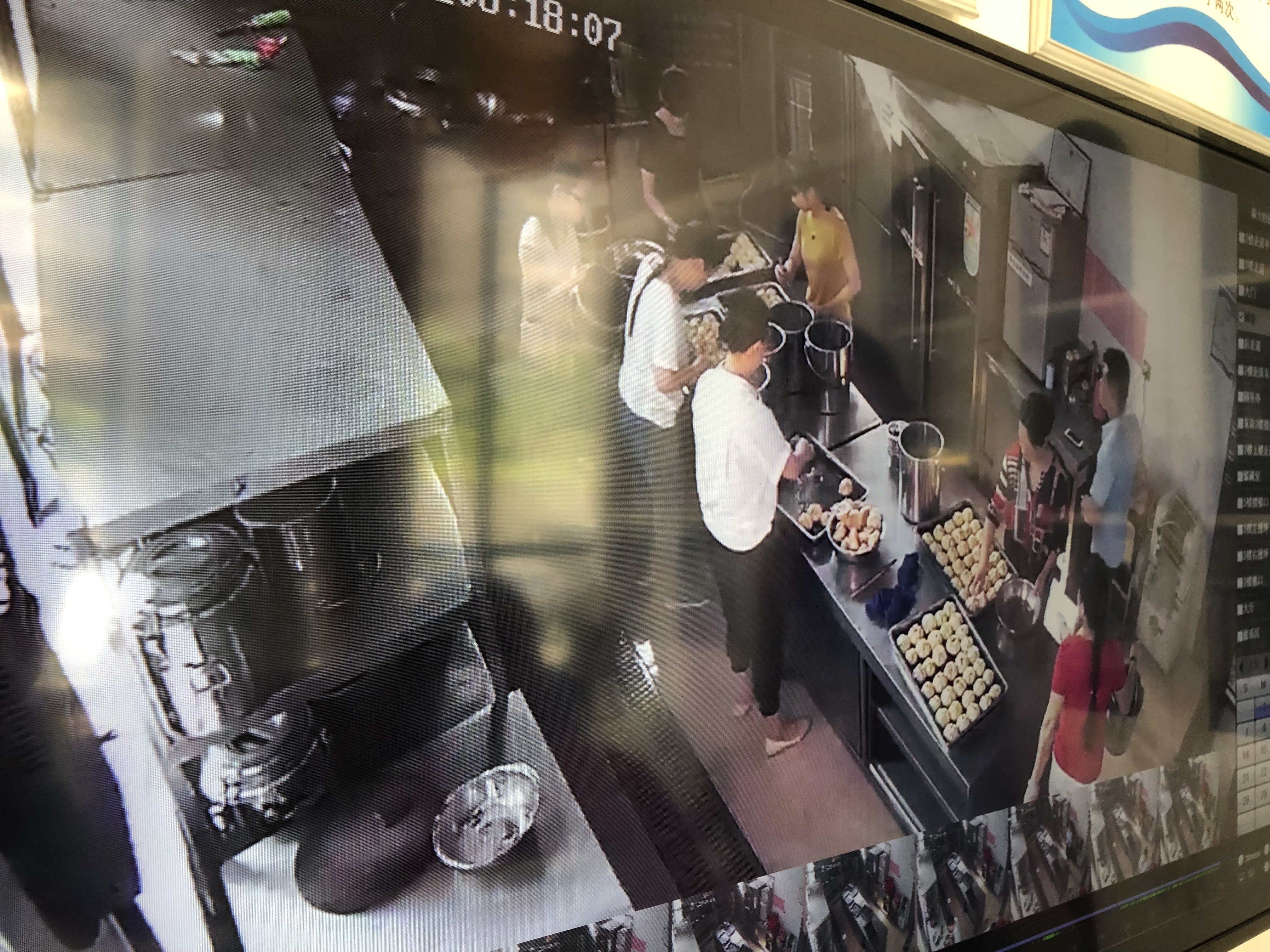 2,食堂工作人员,在工作做饭时,抽烟,吃东西,穿着拖鞋,戴着手表,未戴口罩,便装上阵。直接用勺子试味后直接炒菜,且操作台上都是废弃的塑料袋比较脏乱