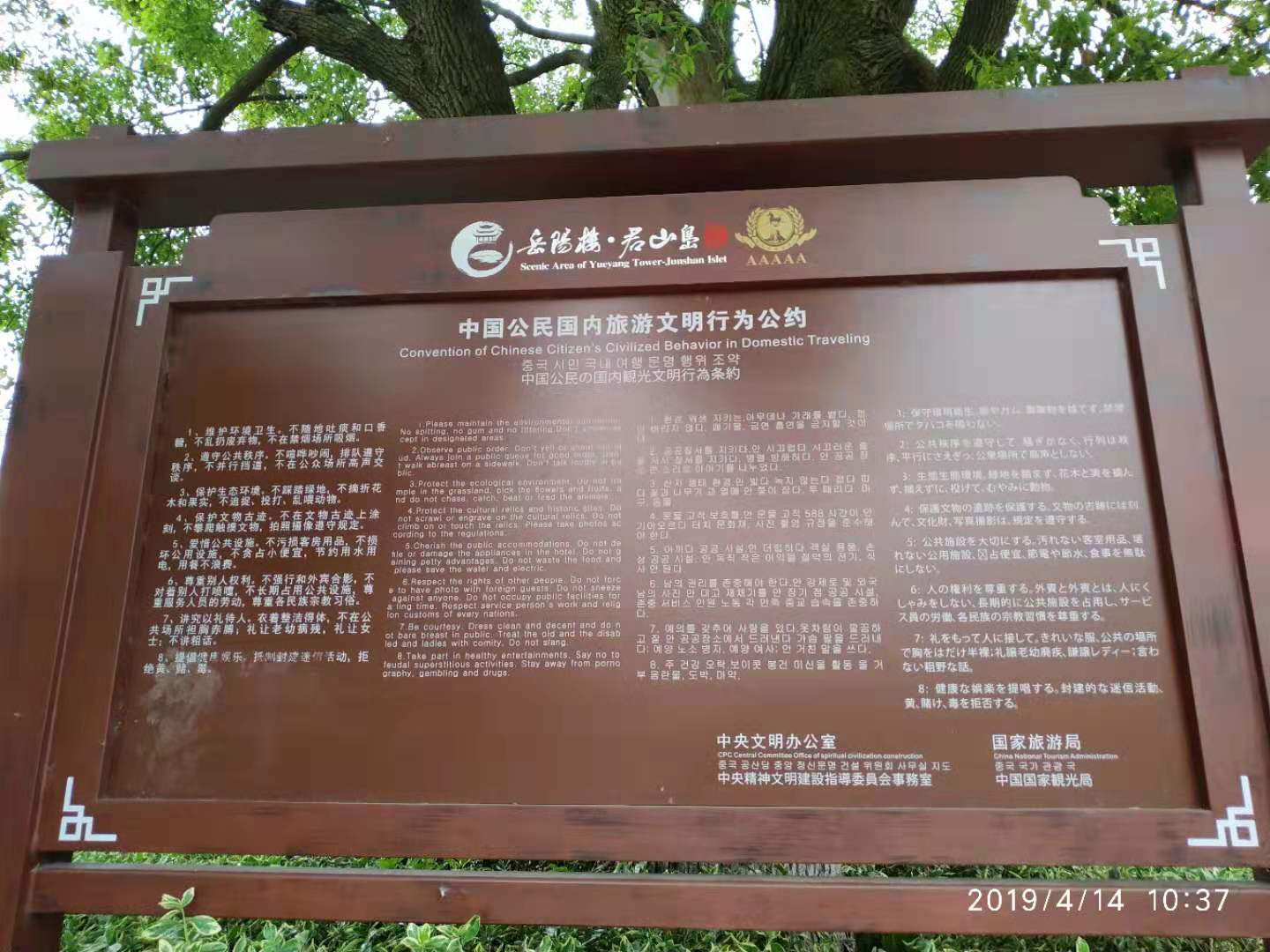 岳阳楼景区门前的“中国公民国内旅游文明公约”指示牌,配有四国文字是否合适,如果外国人来游玩,看见“中国公民国内文明公约"内容可不可以认为该公约只约束中国公民,我认为指示牌应该改为“中国国内旅游文明公约”。或者不应该配有外国文字,请相关部门解析。