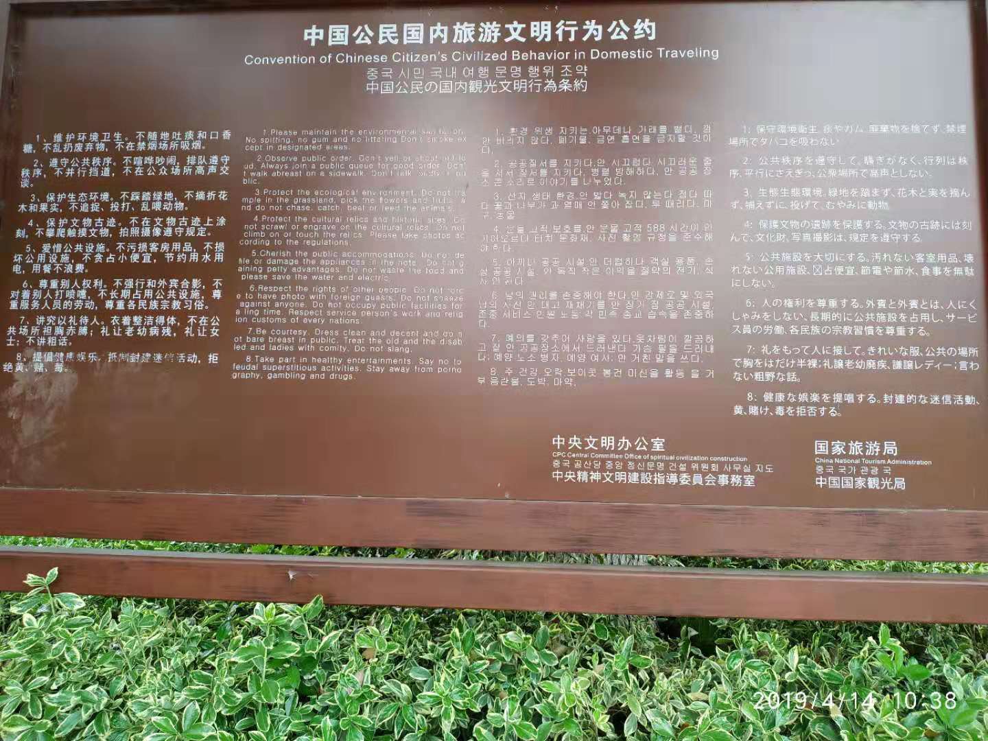 《中国公民国内旅游文明行为公约》是中央文明办联合国家旅游局于2006年10月02日公布。景区标识标牌要求有四国文字,是国家级5A景区要求。