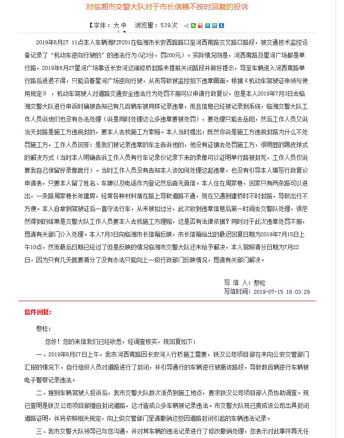 一、我市交警大队对市长热线的工作一直都很重视,要求下属各单位接到市长热线工单后,一般事件工作日当天回复完毕,重大事件第二个工作日也须回复完毕。