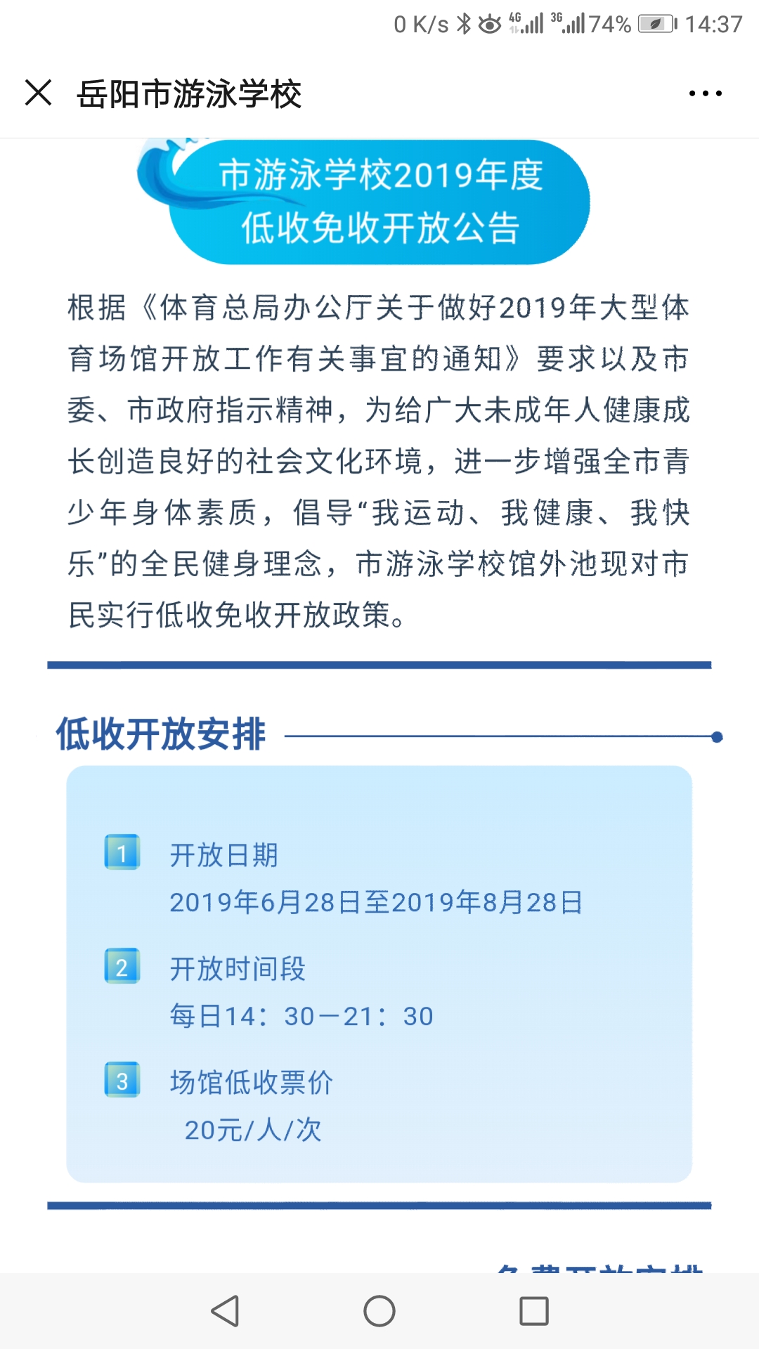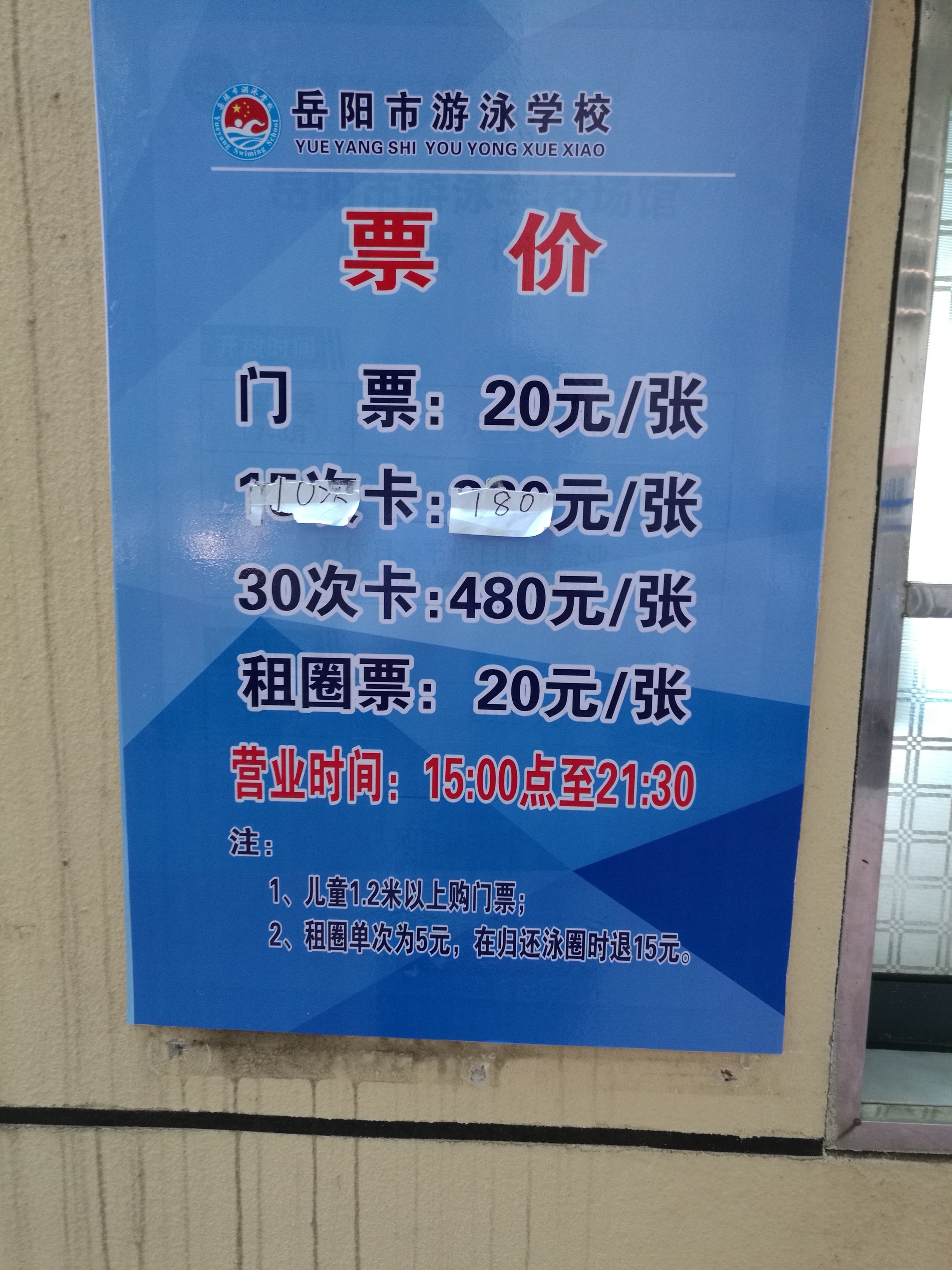 岳阳市游泳学校于6月底公布的泳池低收开放时间为14:30~21:00,我参照的这个时间14:30到了这里,结果发现售票处门口贴的是15点,窗口和大门都紧闭,只能在这大热天的干等半个小时。和我一样14点30到这里来准备游泳的朋友还有很多,游泳池外的椅子上都坐满了。请问为何实际与公告不符?让大家这么大热天的在室外干做半个小时,出现什么意外游校是不是也要担责?