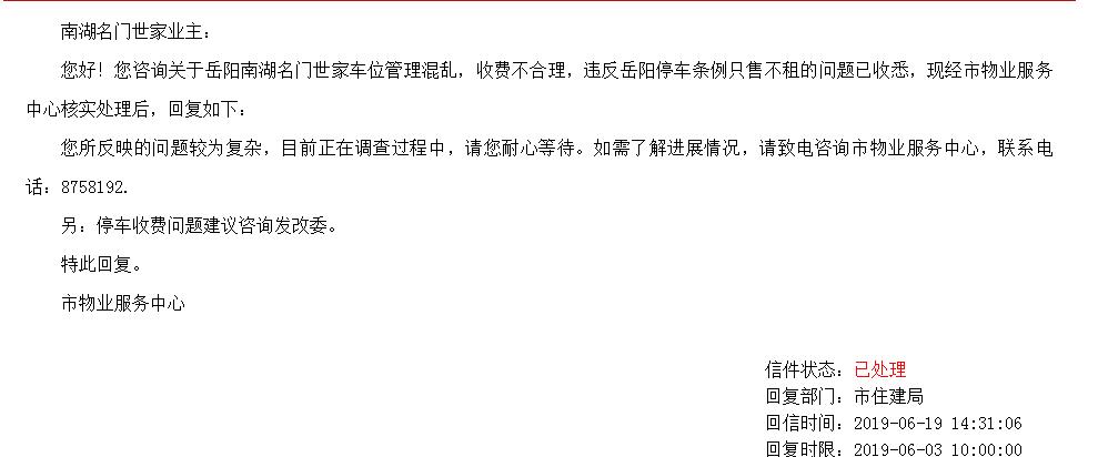 您好!您咨询关于岳阳名门世家世家小区车位只售不租违反最新管理条例的问题已收悉,现经市物业服务中心核实处理后,回复如下: