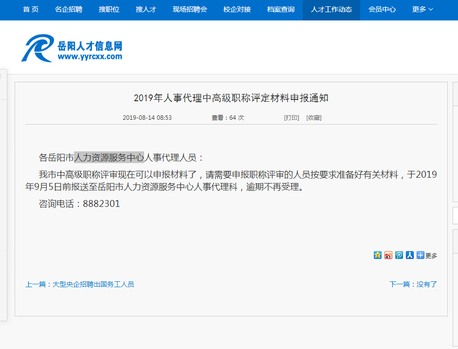 关于岳阳市的2019年人事代理中高级职称评定的问题