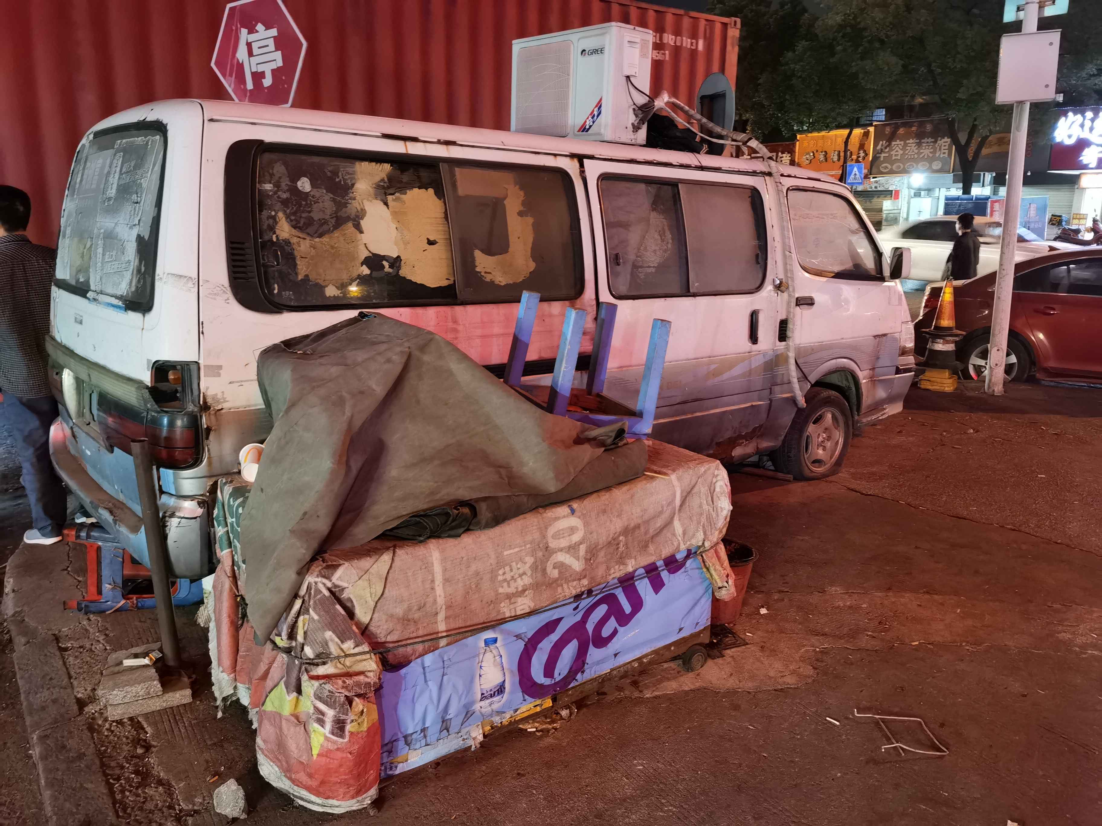 经过火车站对面的金竹街,发现盲道被堵,斑马线被栏断,一条盲道被巨型石墩子和生锈的广告牌两头堵住,斑马线临街道边被数个石墩加铁栏杆锁住,另外一条斑马线行人走过被一辆小面包车一堵了,路摊商贩说这辆车己停放多年,车胎没气,车顶上还装有一空调设备,是辆报费车,系长沙至岳阳商务车喊客人员所为所用。 报费车装空调/石墩子加铁杆装锁停放占用街道和人行道,火车站前行人之多,路人怨声一片……