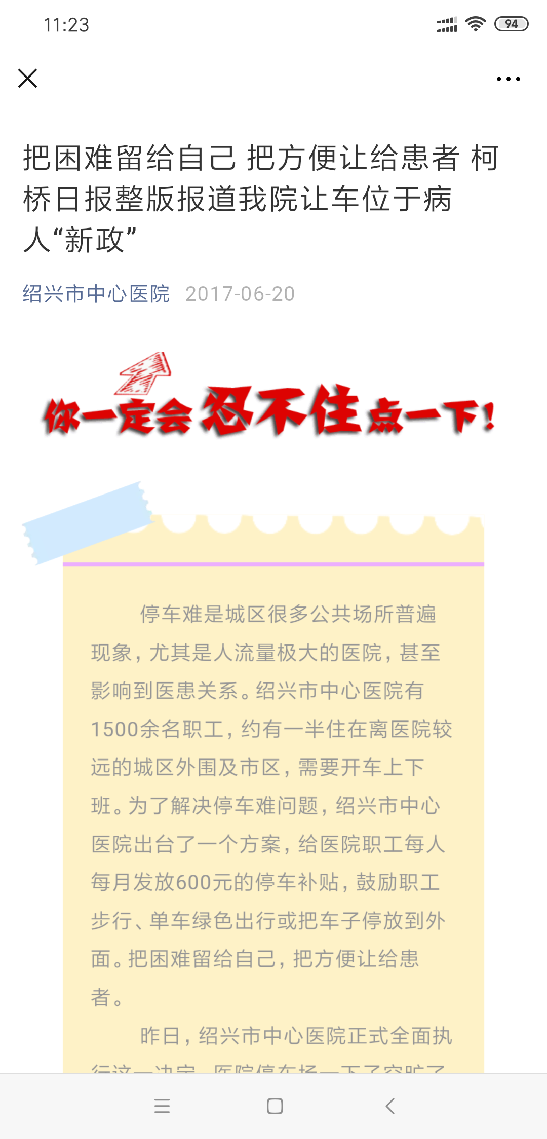 2.第二章图片来源于绍兴市中心医院微信公众号的截图,主要反映的问题是岳阳市一人民医院本部和南院职工停车难题。我们大湖南省内的湖南省妇幼保健院在新湖南大厦以医院名义租下了1000个车位,供职工停车。我们大湖南省内的中南大学湘雅医院在复兴时代金融中心负四楼租下来1000个车位,供职工停车,并在附近道路上建立了专属的交通诱导指示牌。引导广大职工将院内的方便留给病人。今天我到岳阳市一人民医院走访,有许多医院职工的车子停在了医院本部和南院的停车场,希望岳阳一人民医院党委专题研究,尽快与附近的有停车场的商场或者机关单位签订集体车位合同,将岳阳市一人民医院对职工的服务走在全市前列。(微信图片_20191108162746.)