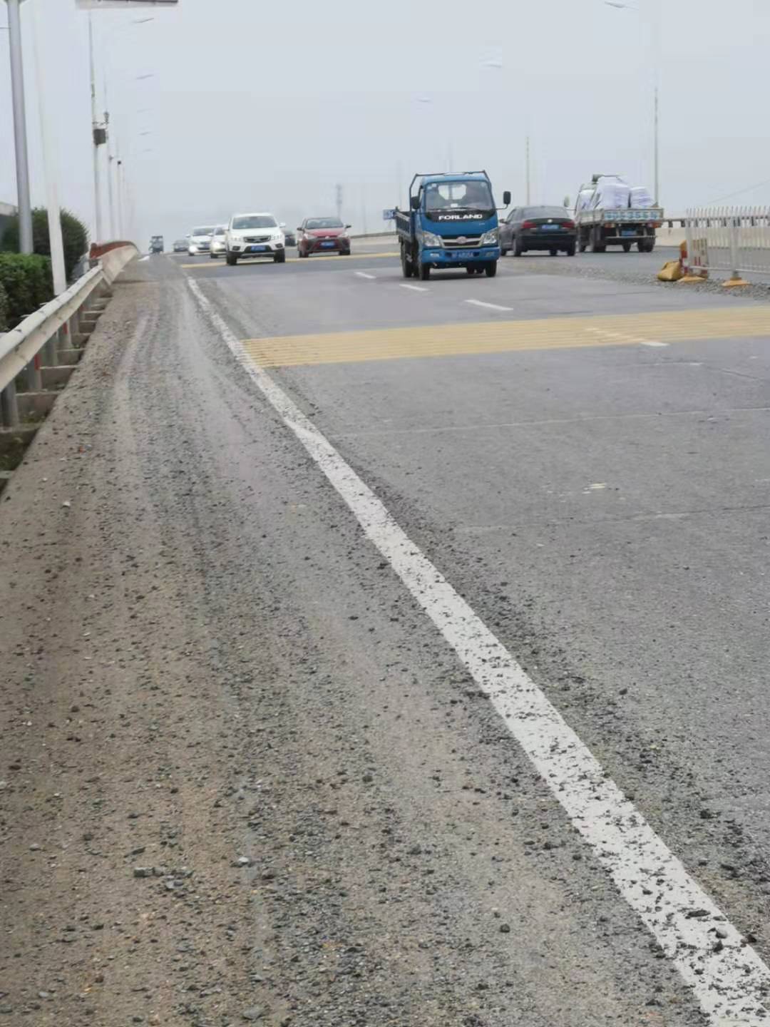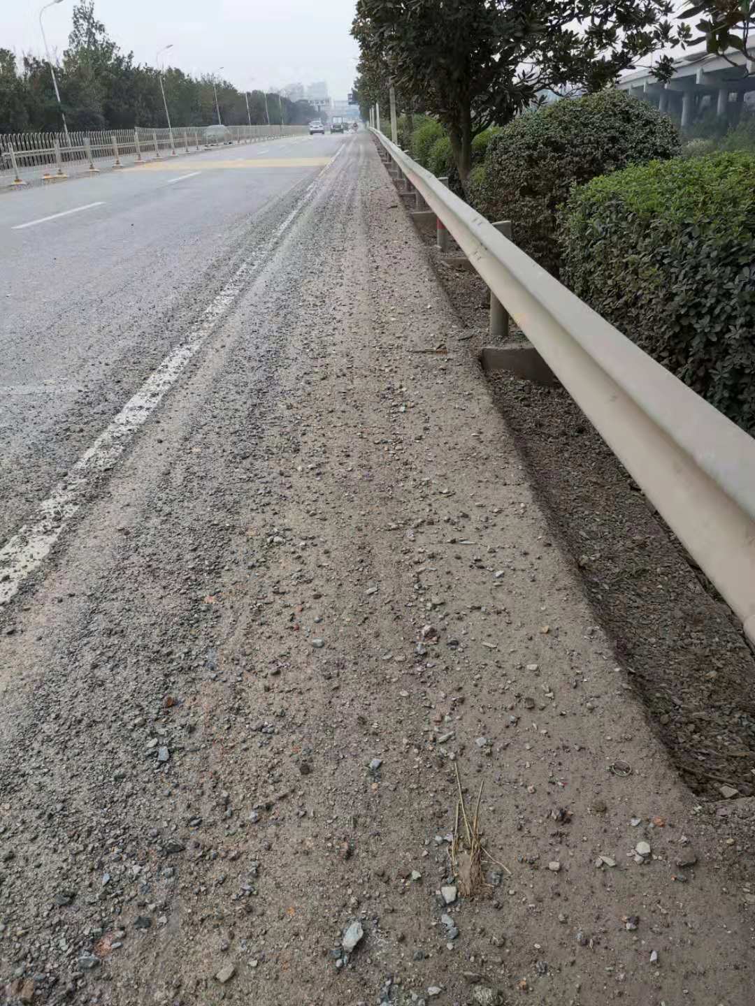 三、河西引桥下坡路段,由于君山区在该路段中央设立了隔离护栏,该段车速快、路面窄,清扫车无法作业,安排人工清扫存在重大安全隐患。