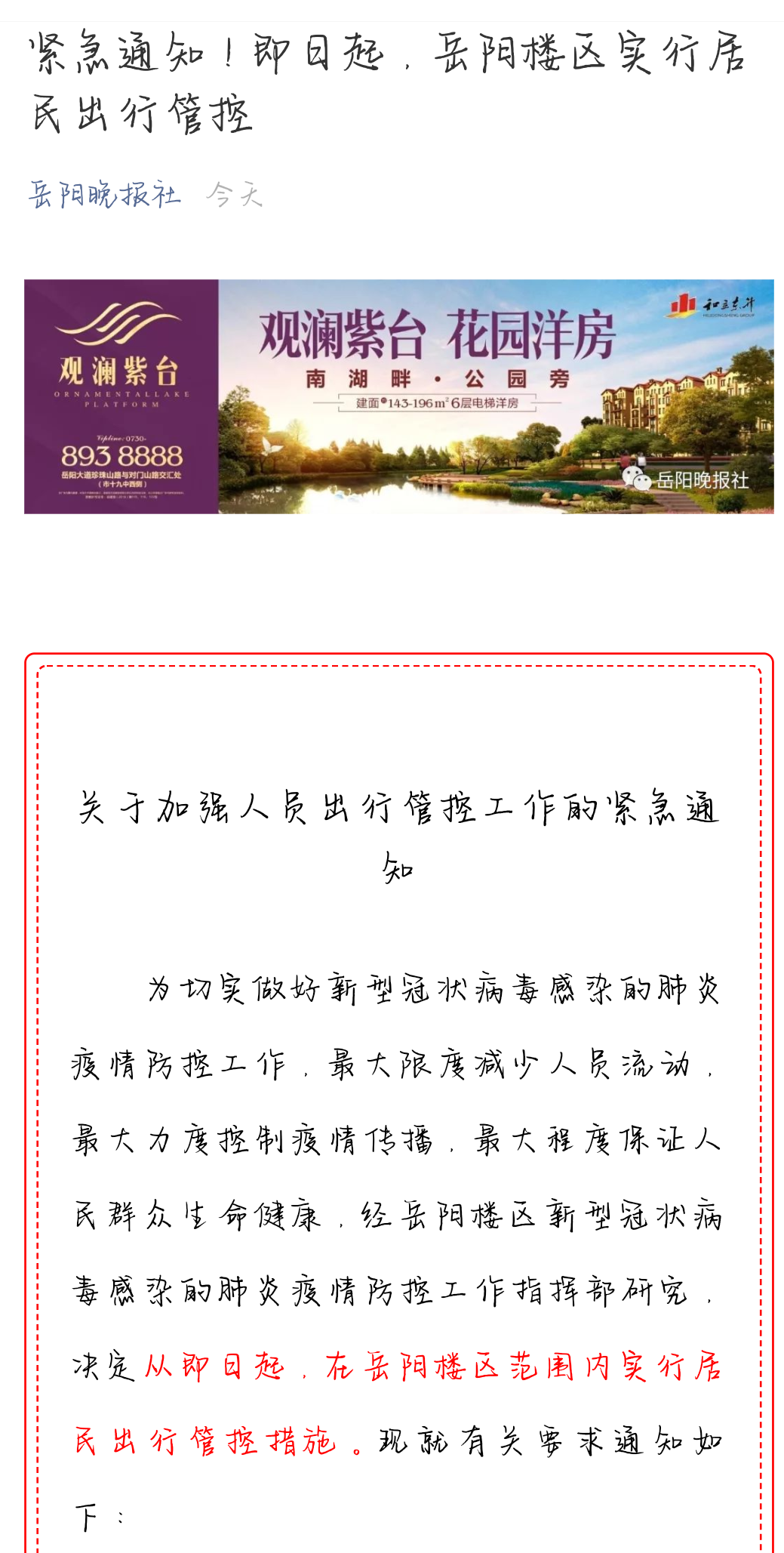 岳阳楼区关于加强人员出行管控工作的紧急通知