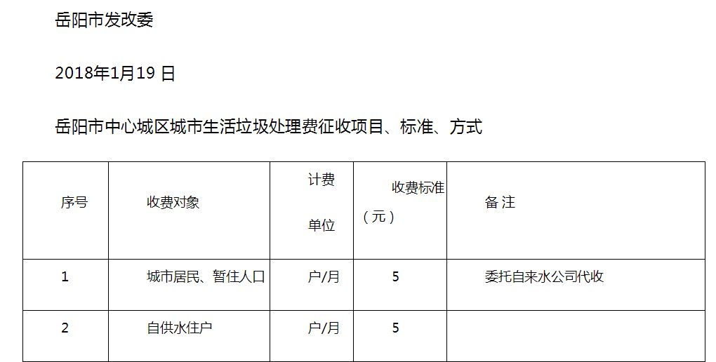 另对已抄表到户的居民用户征收5元/户.月城市生活垃圾处理费, 对未抄表到户使用总表的居民用水户按用水量0.30元/立方米标准征收城市生活垃圾处理费 |