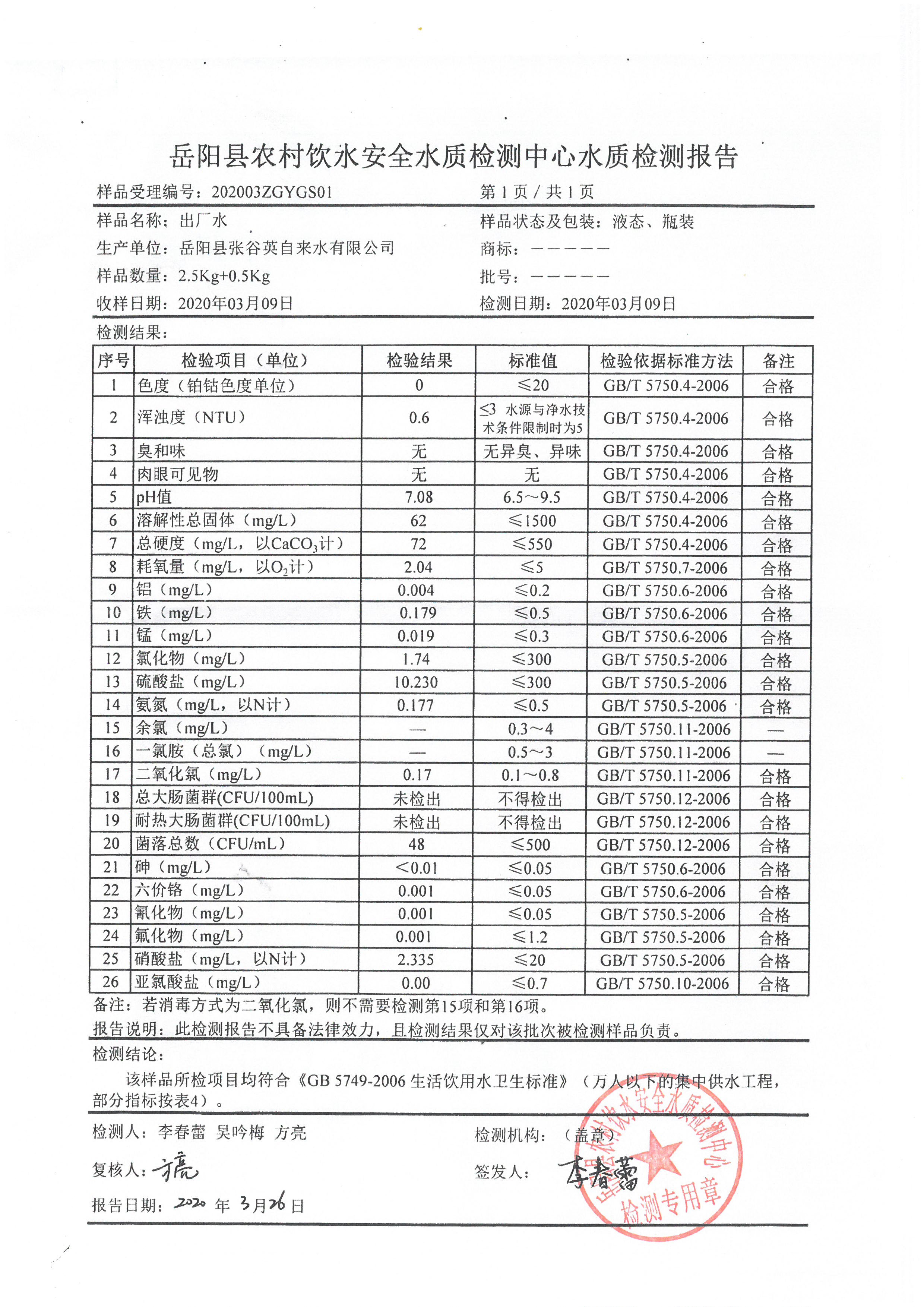 集镇自来水水质检测结果报告图
