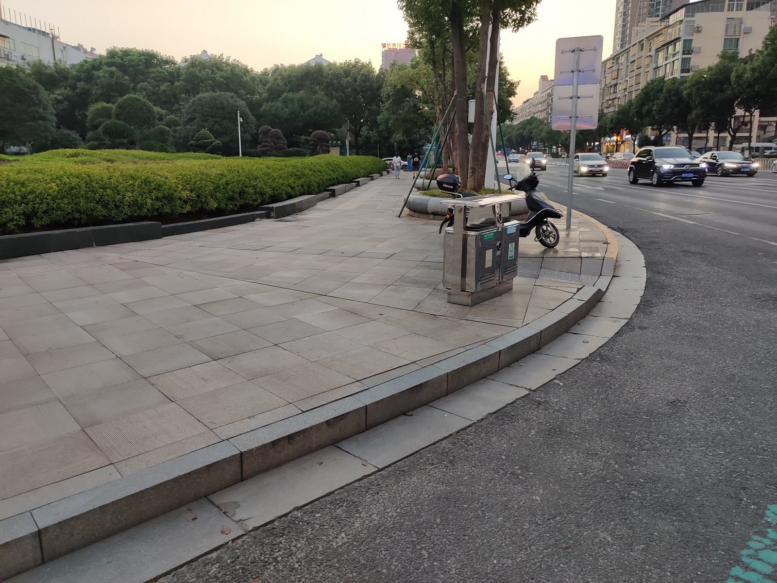 本人最近经常在南湖广场散步,无意中发现南湖广场北侧的两个无障碍通道和进入广场的地方均固定了石墩或石球(如图1),除了阻止摩托车进入广场意外,轮椅和婴儿车也统统被挡在了外面,时不时就会看到有人在抬轮椅或抬婴儿车,石球高度大约有40厘米,旁边最矮的台阶也有两阶,力气小点或者一个人还真的难以应付,有些人看到往两侧一点还有个没有被阻挡得坡道(如图2),兴致勃勃地推车过去绕一圈回来,发现还是被人行道上的石墩挡住了,且如果不想把车子搬过40公分高的石墩,那就要搬下人行道,再推一段,再搬上广场。。。一个岳阳标志性的大型广场,连个可用的无障碍通道都没有吗?难道就没有更合理的办法能在阻挡摩托车进入的同时,让婴儿车和轮椅能够顺利进入广场吗?比如设置低矮的铁栏杆,轮椅可以跨在上面迂回进入,至少不用抬。