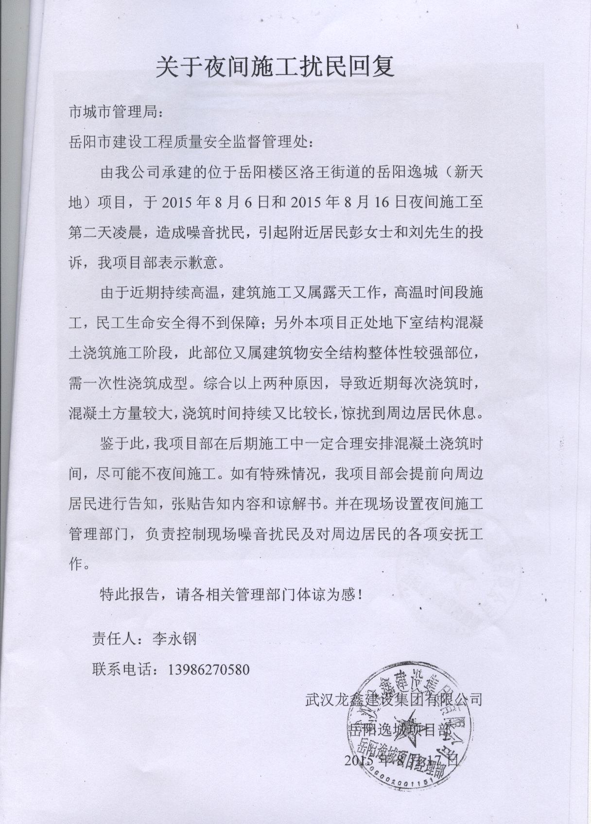 针对以上情况,市质安处已召集岳阳新天地项目的建设、施工、监理方进行约谈,责令该项目的施工企业武汉龙鑫建设有限公司调整作业时间,因工序、工艺要求确需连续作业的,应于施工前到相关部门办理夜间施工许可,并在工地周边醒目位置张挂施工告示,对影响范围内的居民做好沟通解释工作。施工企业也已承诺重新调整作业计划,合理划分施工段,确保后期不在出现夜间施工扰民的问题,市质安处将进一步跟踪该问题的处理情况。若责任单位拒不整改的,我处将建议环保部门依据《中华人民共和国环境噪声污染防治法》的有关要求进行处罚。