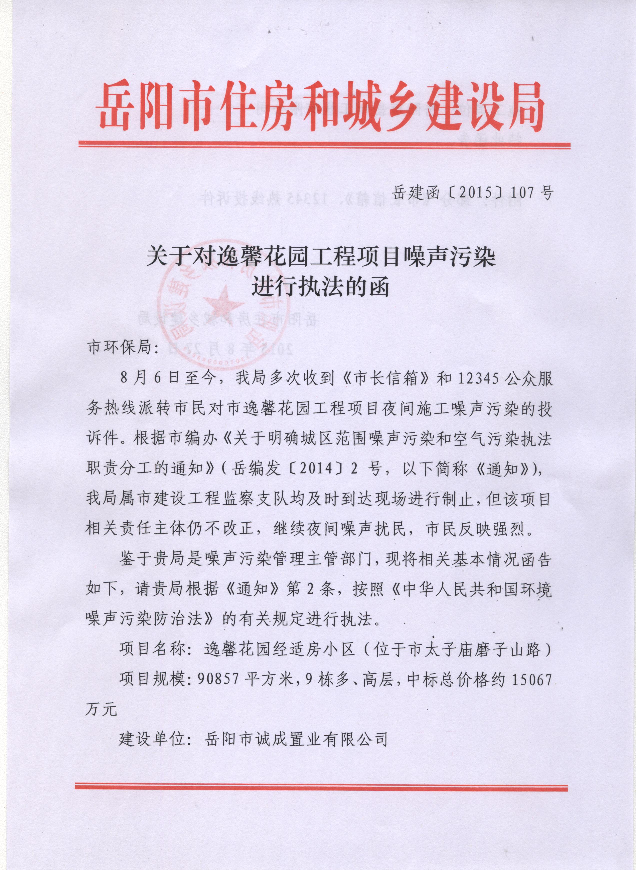 您好!关于逸馨花园项目噪声扰民的问题,我局根据市编办《关于明确城区范围噪声污染和空气污染执法职责分工的通知》(岳编办发[2014]2号)文件要求,向市环保局送达《关于对逸馨花园工程项目噪声污染进行执法的函》(岳建函[2015]107号),具体内容详见附件(扫描件)。