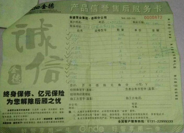本人购买新房一套,2015月6日开始装修,装修水暖管材在金德管业岳阳分公司购买(有凭证),房子装修好后,一直尚未搬迁入住。2016年2月27日 凌晨接物业通知,厨房热水器预埋在墙体中铜管(管材配件)断裂,整个房间厨房、客厅及三间卧室木地板及柜子被淹,部分墙面涂料水迹明显,局部掉落初步估计损失约为6-8万元。2016年2月28日通知该销售商一同到我家新房看现场情况,经销商当时答复,须上报总公司。事后经销商回复“该配件不是该公司产品”,经拨打《产品信誉售后服务卡》上金德管材全国服务热线0731-22999333在第一次电话接通后再也无法打通。经登录金德管业与QQ客户联系,提供了一个15073330256的售后电话,也毫无处理问题态度。事后,手机号为15202888049的电话打来,仍否定为该公司产品。经拨打12315热线,工商部门联系销售商,该销售商仍抵赖。希望能在这里讨个公道,希望能借贵网之力,帮助我们老百姓维权。 希望能尽快得到回复,尽快要求金德解决此事,非常感谢!