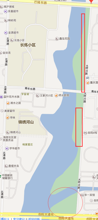 二是青年路和岳阳大道之间的大桥河路中段(亮山花园对面),这里一直用围栏围着,貌似现在已经成了一些居民的私家菜地还有垃圾场。这段南侧和北侧都建好了运动场和休闲场地,但是不知道为什么唯独这段一直用围栏围着也不见有任何开发行为。如能利用起来建个停车场或者开发成休闲广场那就很好了。