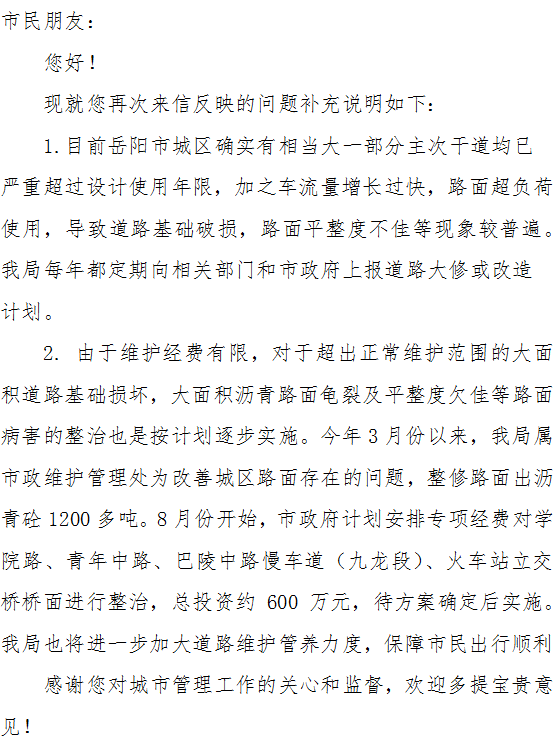 您的来信“岳阳城区路面干道大面积出现破损严重”已收悉。现就有关情况回复如下:
