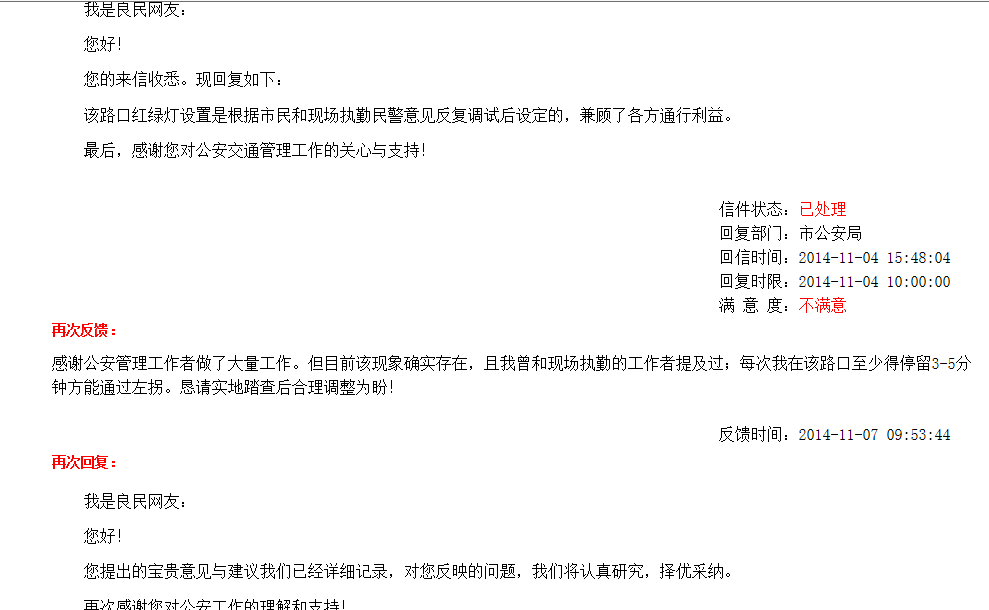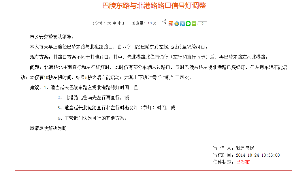 本人于2014年10月在市长信箱提及“巴陵东路与北港路路口信号灯调整”问题,支队回复了意见并采纳了建议(详见附件)。再次表示感谢!