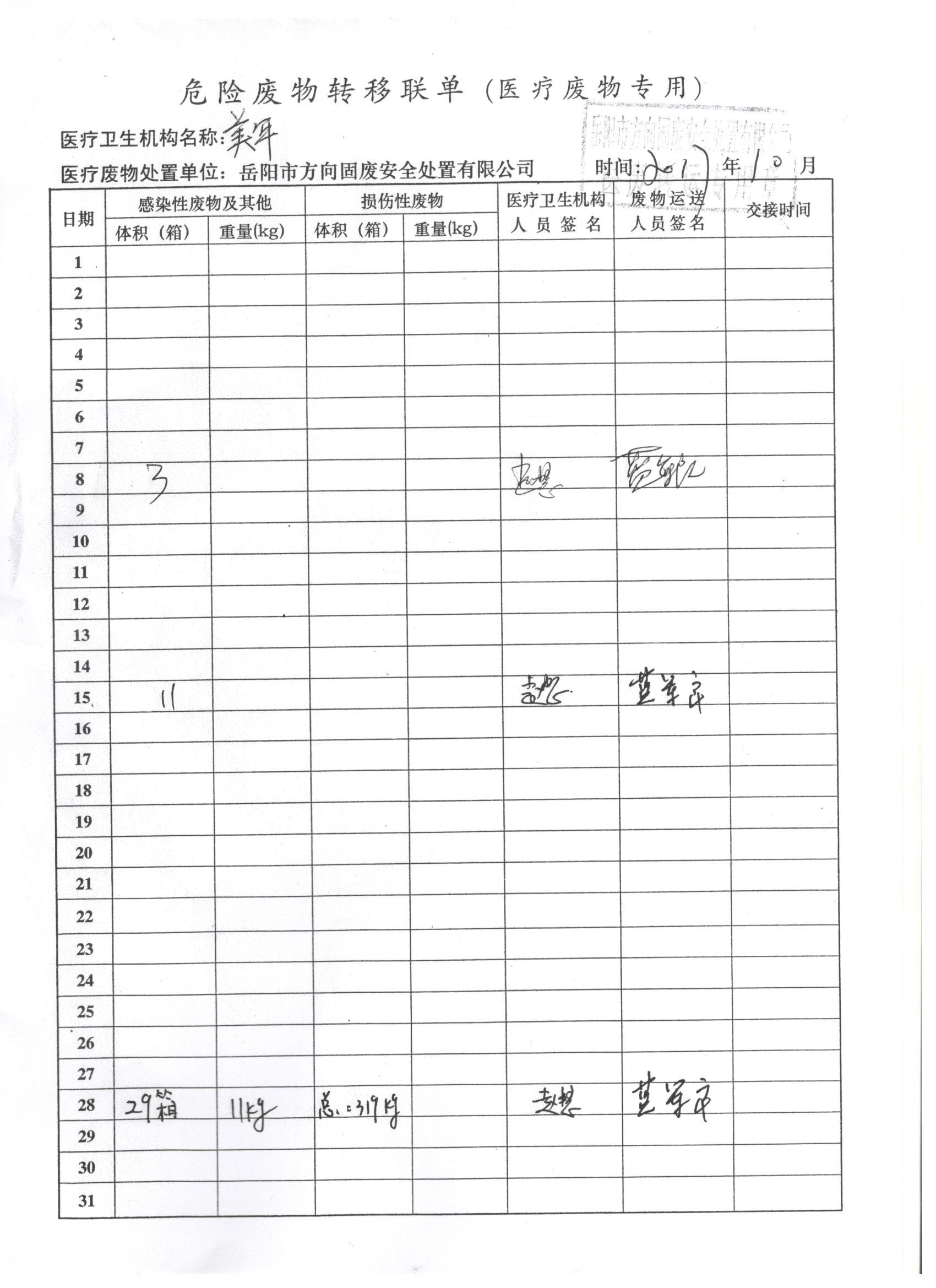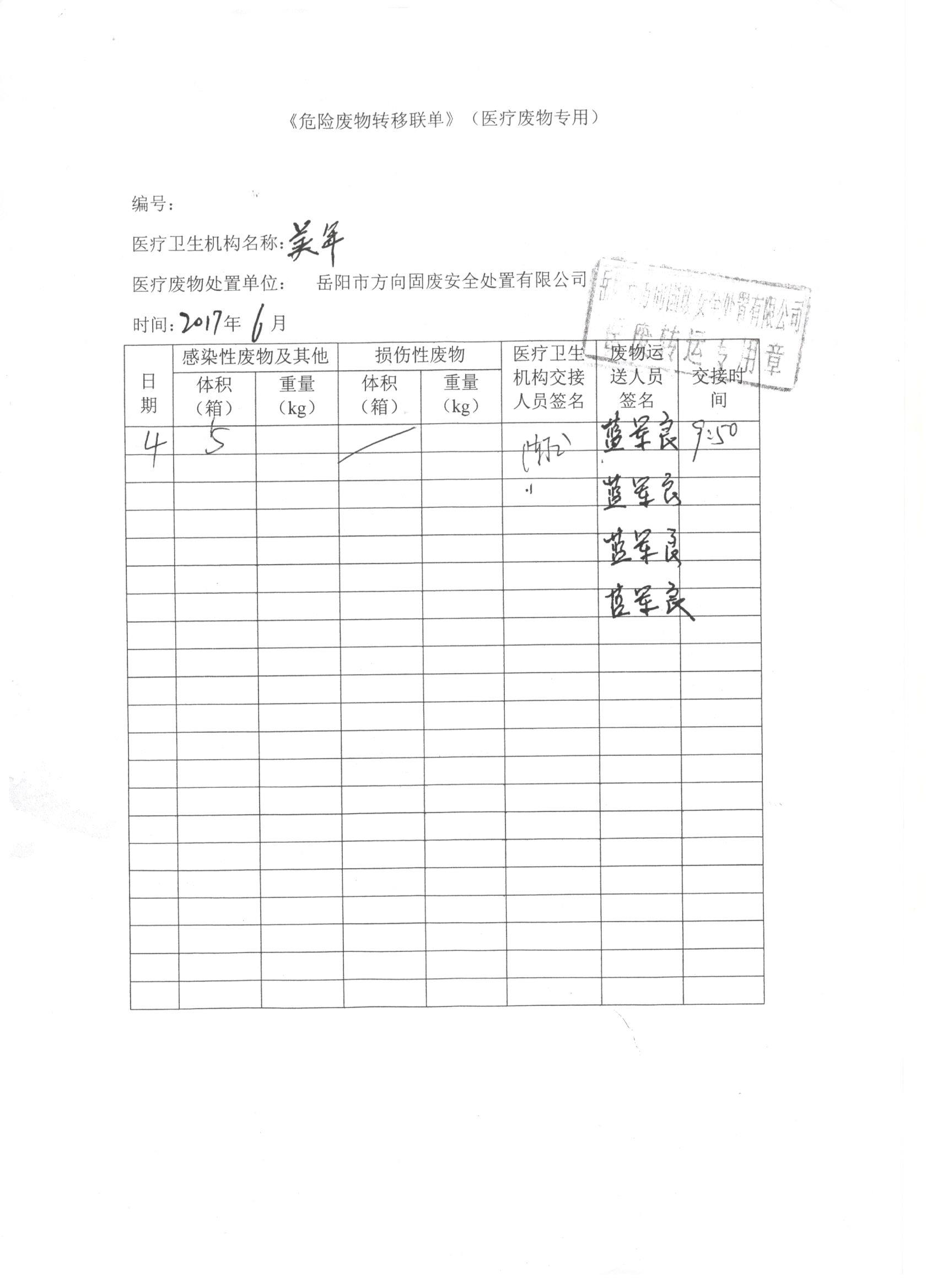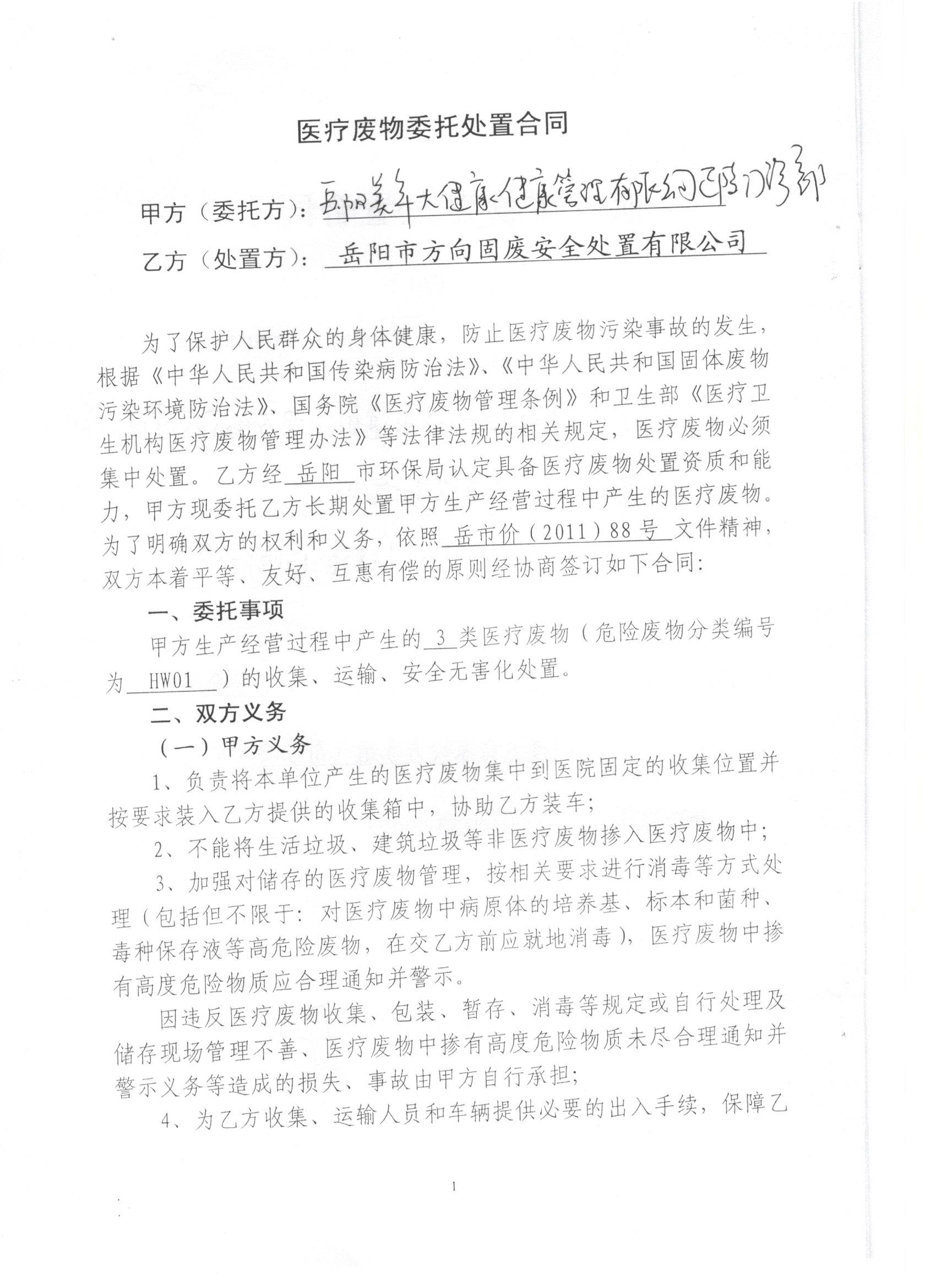 我司于2016年10月17日与岳阳市方向固废安全处置有限公司(以下简称“方向固废”)签订了《医疗废物委托处置合同》,有效期至2017年9月30日,合同价格为8000元。