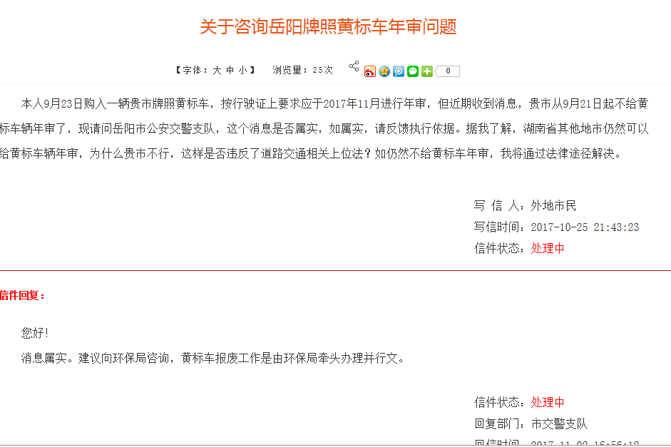 本人9月23日购入一辆贵市牌照黄标车,按行驶证上要求应于2017年11月进行年审,10月25日我通过市长信箱咨询了岳阳市公安交警支队,支队反馈关于不予黄标车年审的文件是市环保局行文的。对这个反馈我不满意。首先车辆年审是交警支队的工作,并不是市环保局来年审及报废,交警支队这样回应就是在踢皮球。其次我国已取消“黄绿标”,为什么贵市仍然出台文件限制黄标车年审?根据我国道路交通安全法第13条之规定:只要提供车辆购强制责任险单及行驶证,应予以年检。现在贵市环保局出台文件并要求交警支队不给黄标车年检,与道路安全法等上位法相违背了。如仍然不给黄标车辆年检,我将立即发律师函并通过司法途径上诉。
